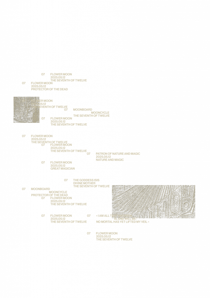 Figure centrale de la mythologie égyptienne et des traditions ésotériques, Isis est la déesse de la vie, de la guérison, de la magie et du féminin sacré. Mère universelle, initiatrice et gardienne des cycles, elle veille sur la mort comme sur la renaissance. Dans l’ésotérisme, elle est la souveraine des mystères, celle dont le voile ne se lève qu’aux âmes prêtes à comprendre les lois cachées de la nature. À cette période de l’année, où tout s’ouvre, fleurit, et revient à la lumière, Isis incarne pleinement l’énergie de la Pleine Lune de Fleur : elle guide les renaissances intérieures, protège les transformations lentes et profondes, et nous relie à la sagesse du vivant.